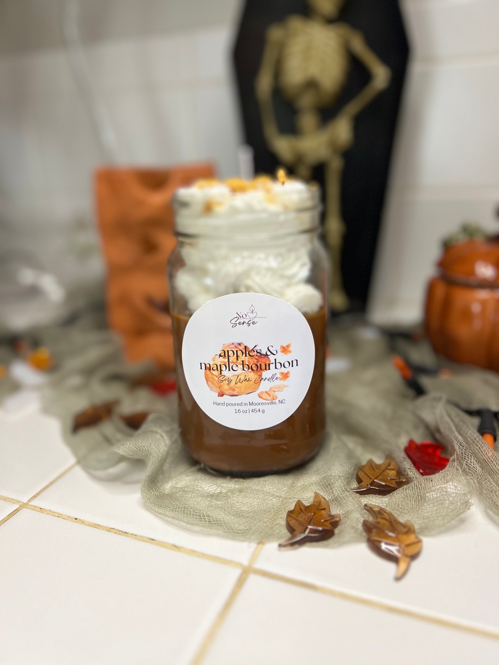 Indulge in the delicious scent of apples and maple bourbon with our hand-poured soy wax candle. The 16 oz mason jar adds a charming touch, while whipped wax and wax crumbles on top add a fun twist. Enjoy the cozy vibes and warm ambiance this candle brings to any space.