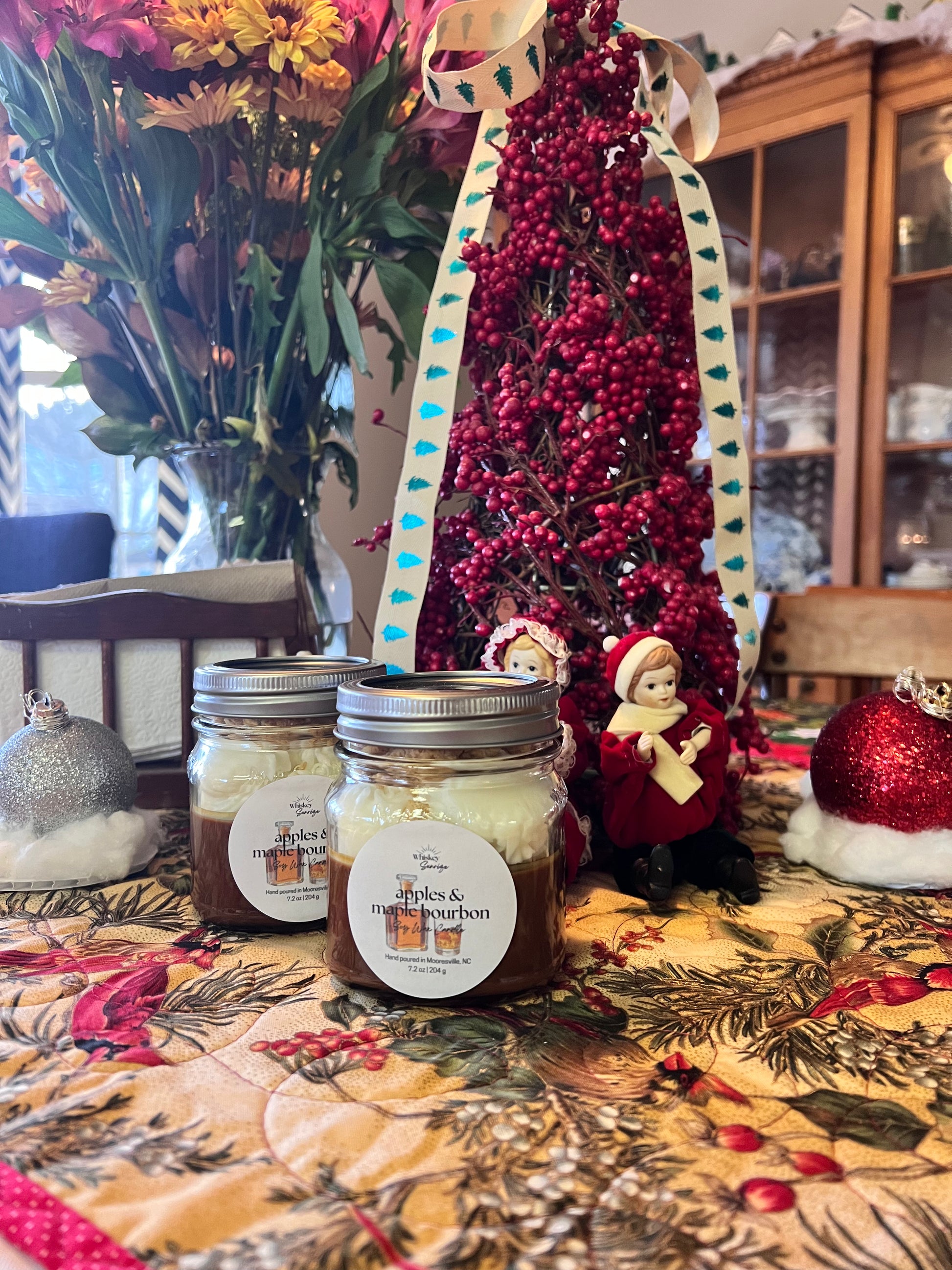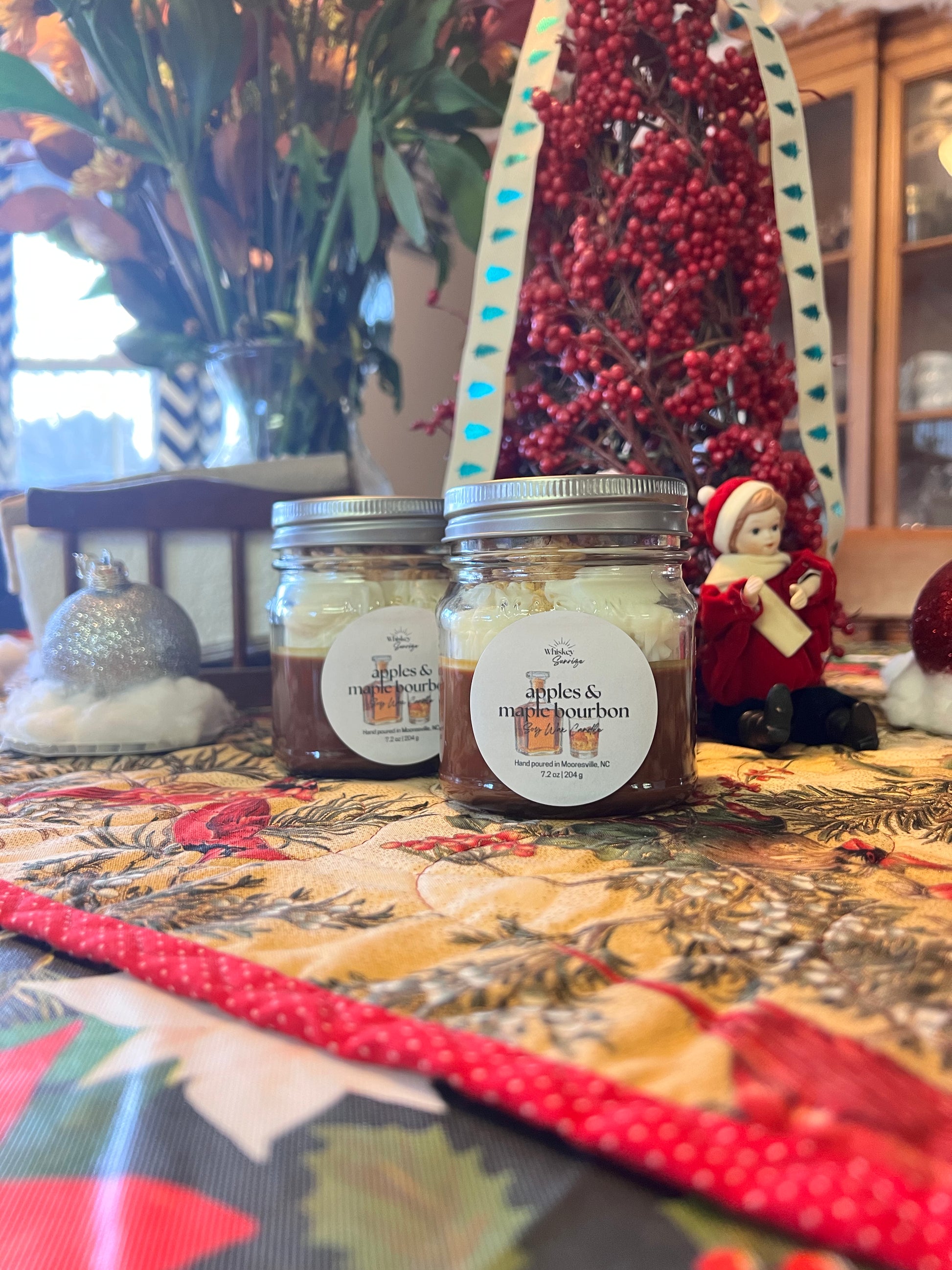 Indulge in the delicious scent of apples and maple bourbon with our hand-poured soy wax candle. The 8 oz mason jar adds a charming touch, while whipped wax and wax crumbles on top add a fun twist. Enjoy the cozy vibes and warm ambiance this candle brings to any space.