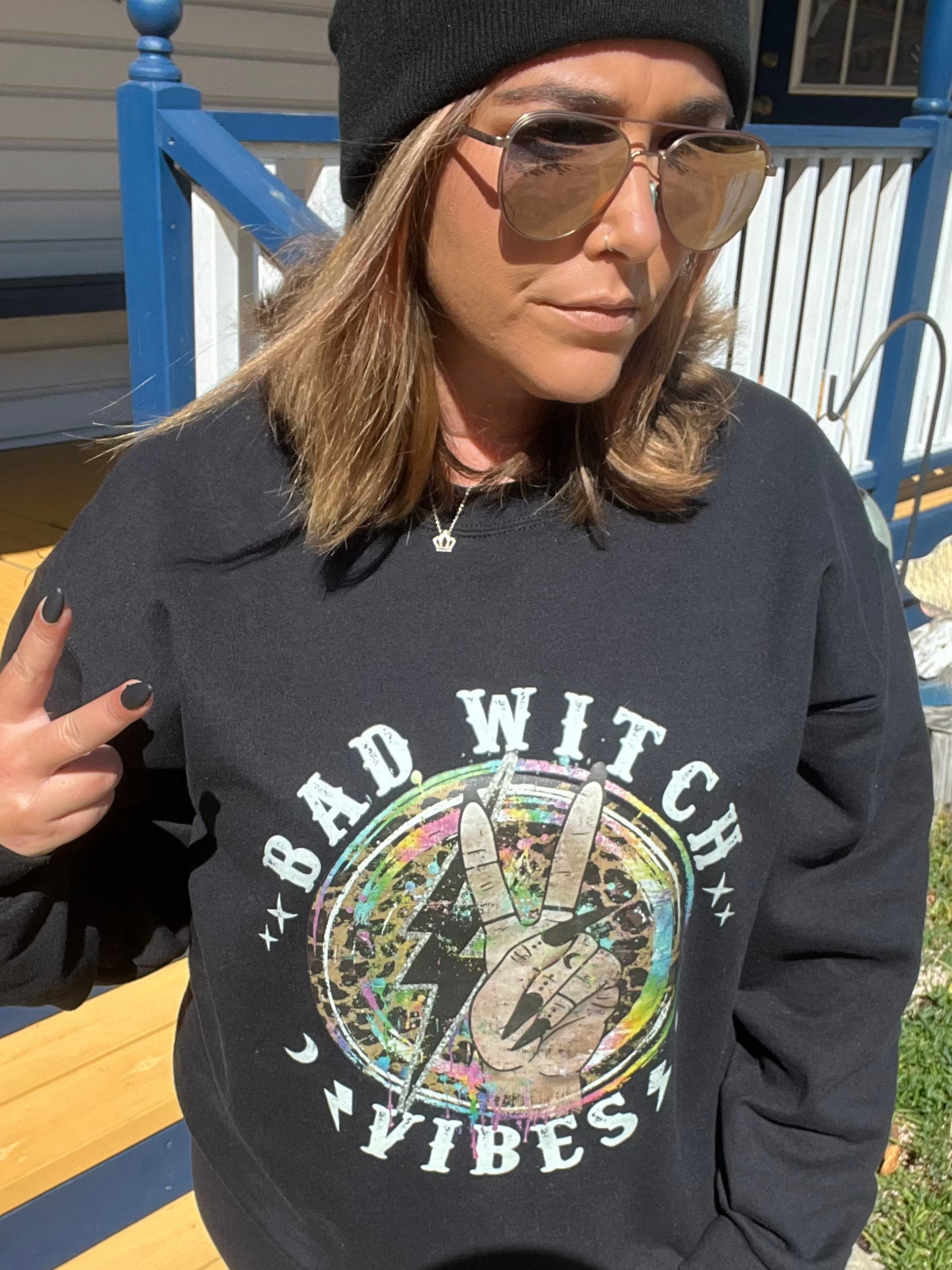 - Bad witch vibes peace sign splatter glow in the dark screen print transfer on the front