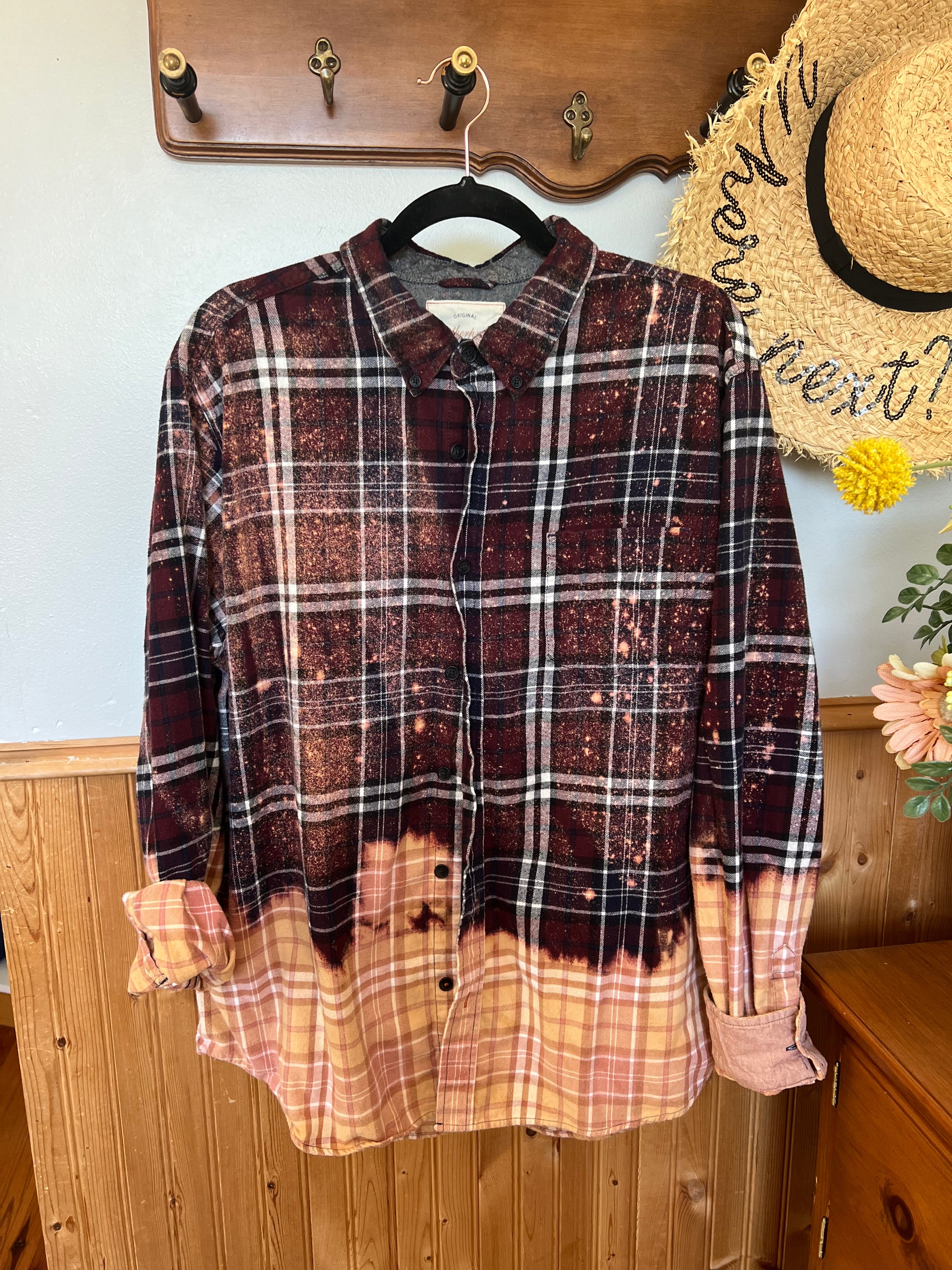 - Burgundy, navy blue plaid colored flannel bleach dipped with a faded peach color