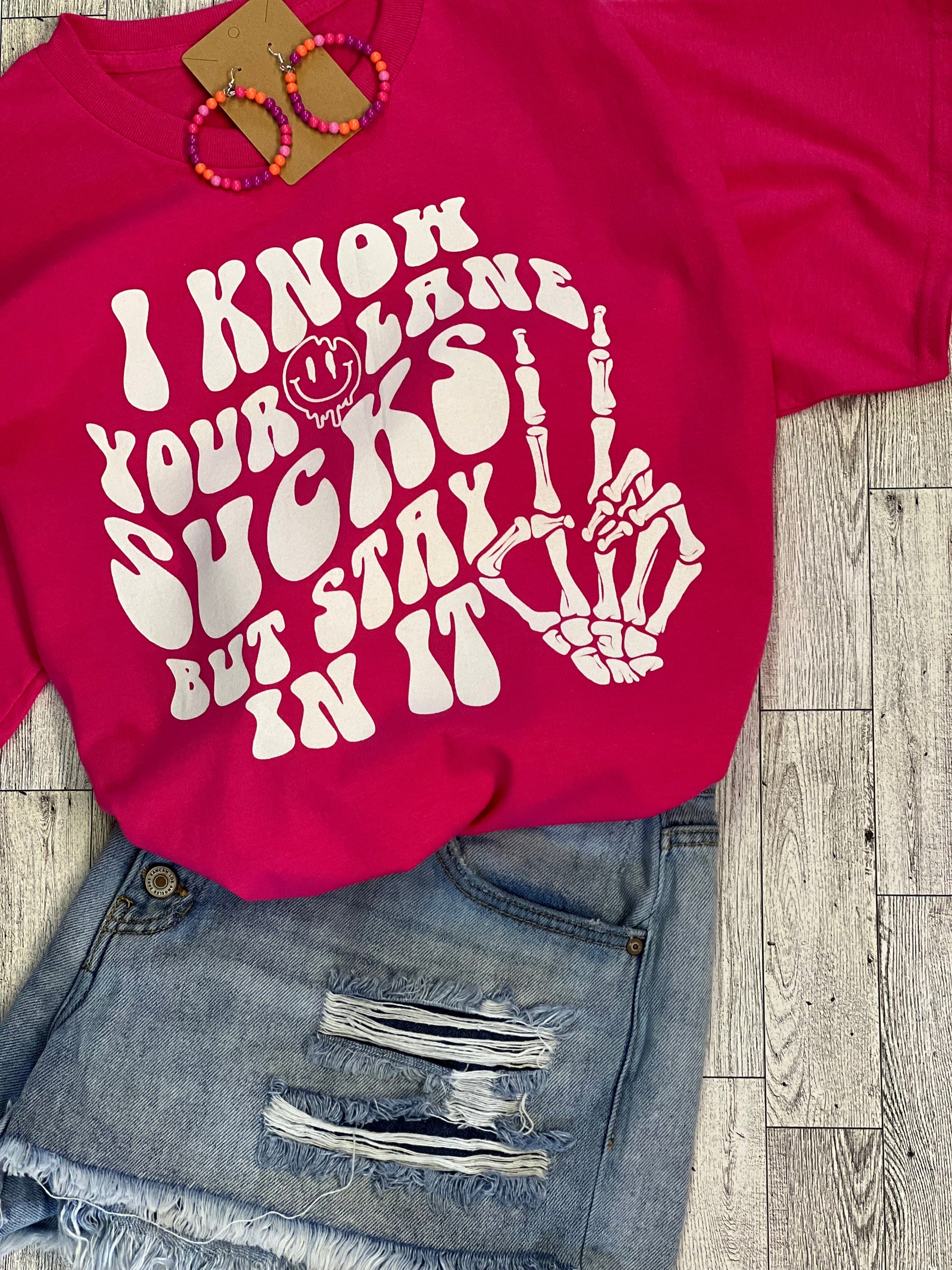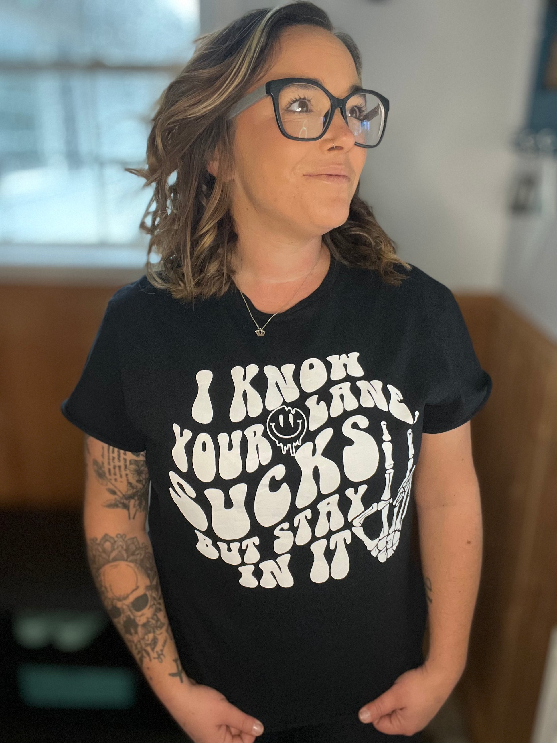 You don't need to tell 'em twice! Keep the haters in their lane as you flaunt this fashionable, sarcastic fashion tee. Go ahead and petal to the metal - this one's sure to take you from zero to fashion hero. #stayinyourlane!