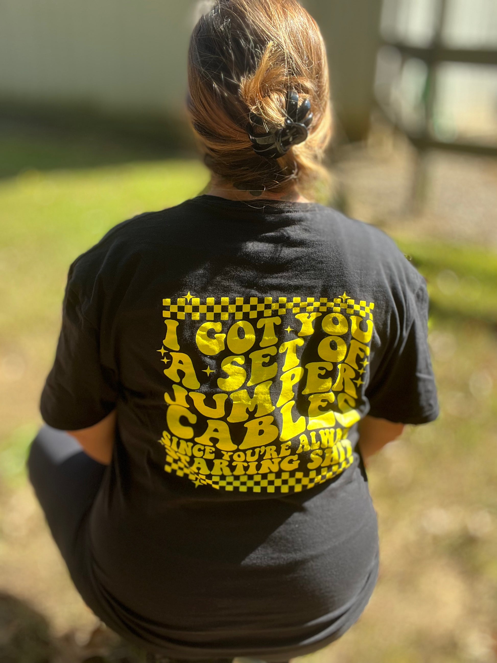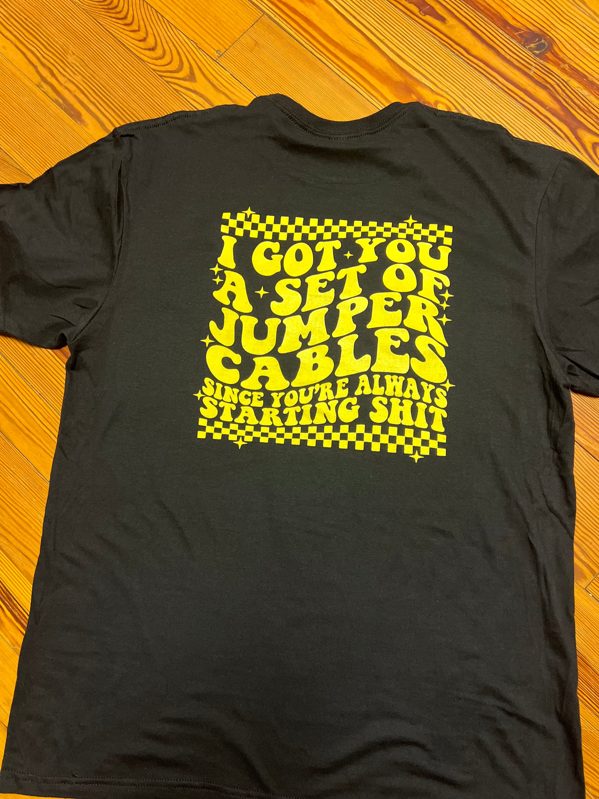 For those always starting something, here's a tee that will keep ya jumpin'! This shirt's come with a set of jumper cables to keep that engine running no matter the shenanigans. (Figuratively speaking, of coarse) Keep the fun revved up - it's time to get the party started! ;) Because there is always that one person always starting sh!t!