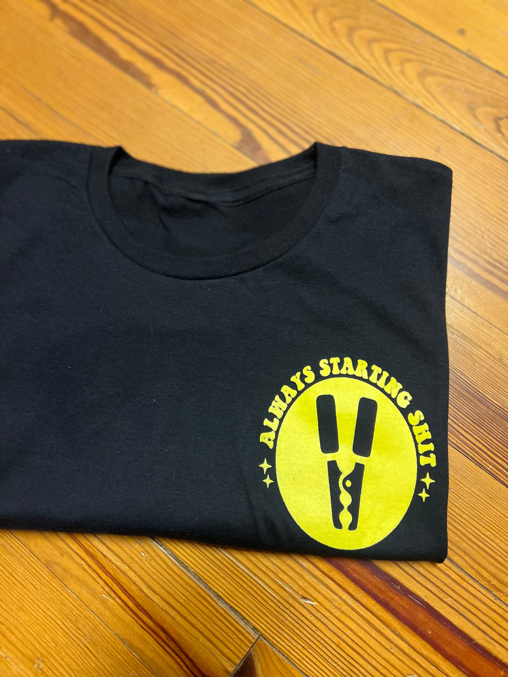 - Neon yellow always starting shit with jumper cables screen print transfer on the front left pocket