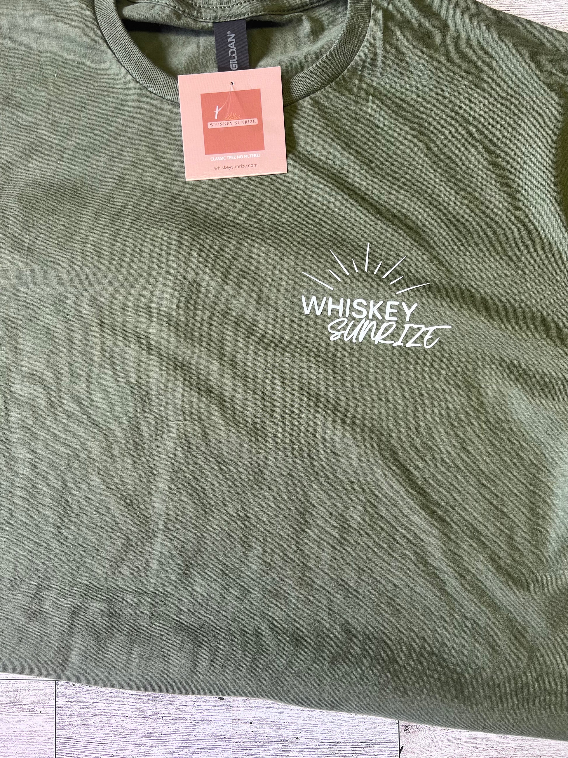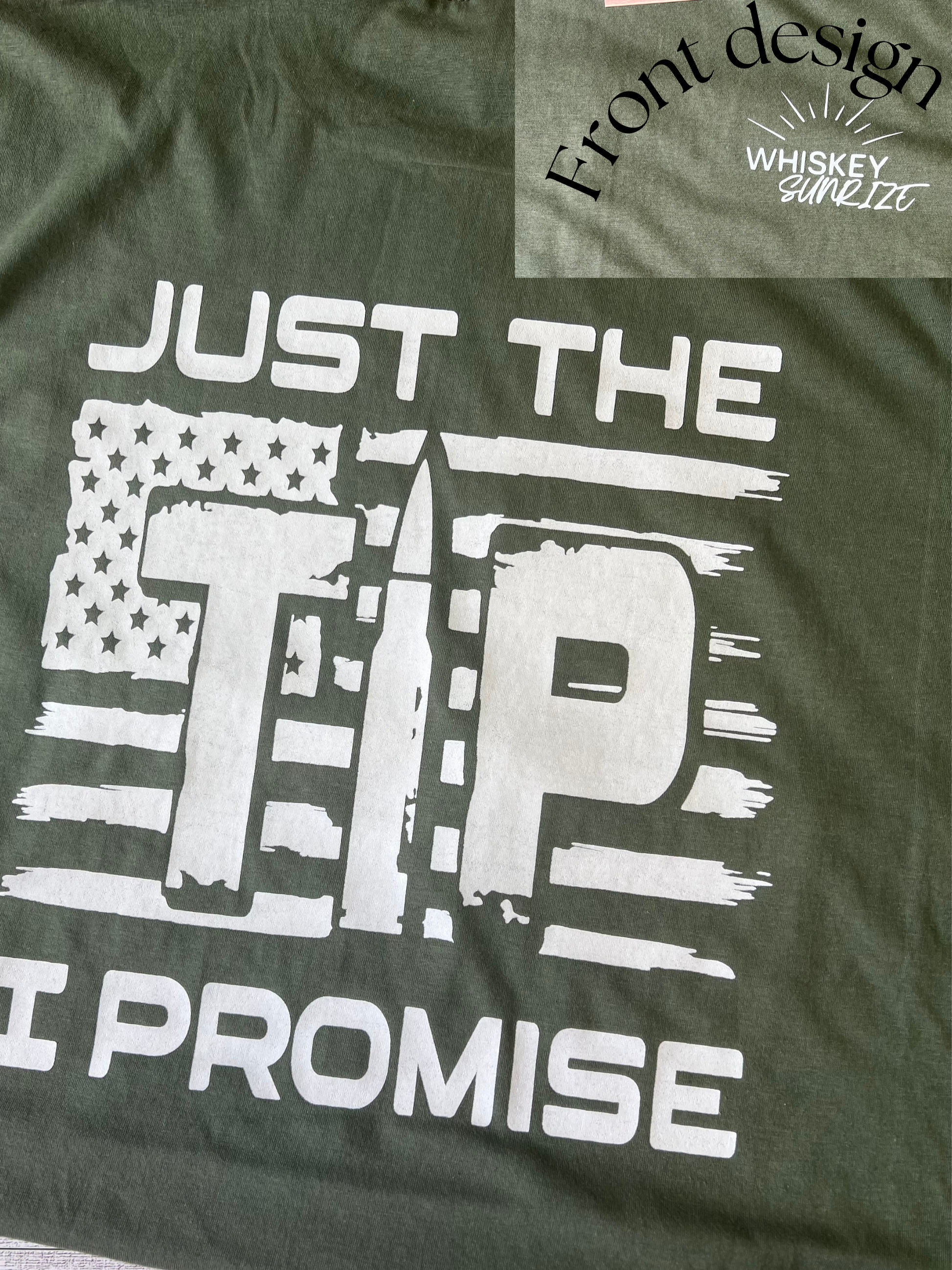- Just the tip I promise white screen print transfer on the back/ whiskey sunrize logo front left pocket - option 2