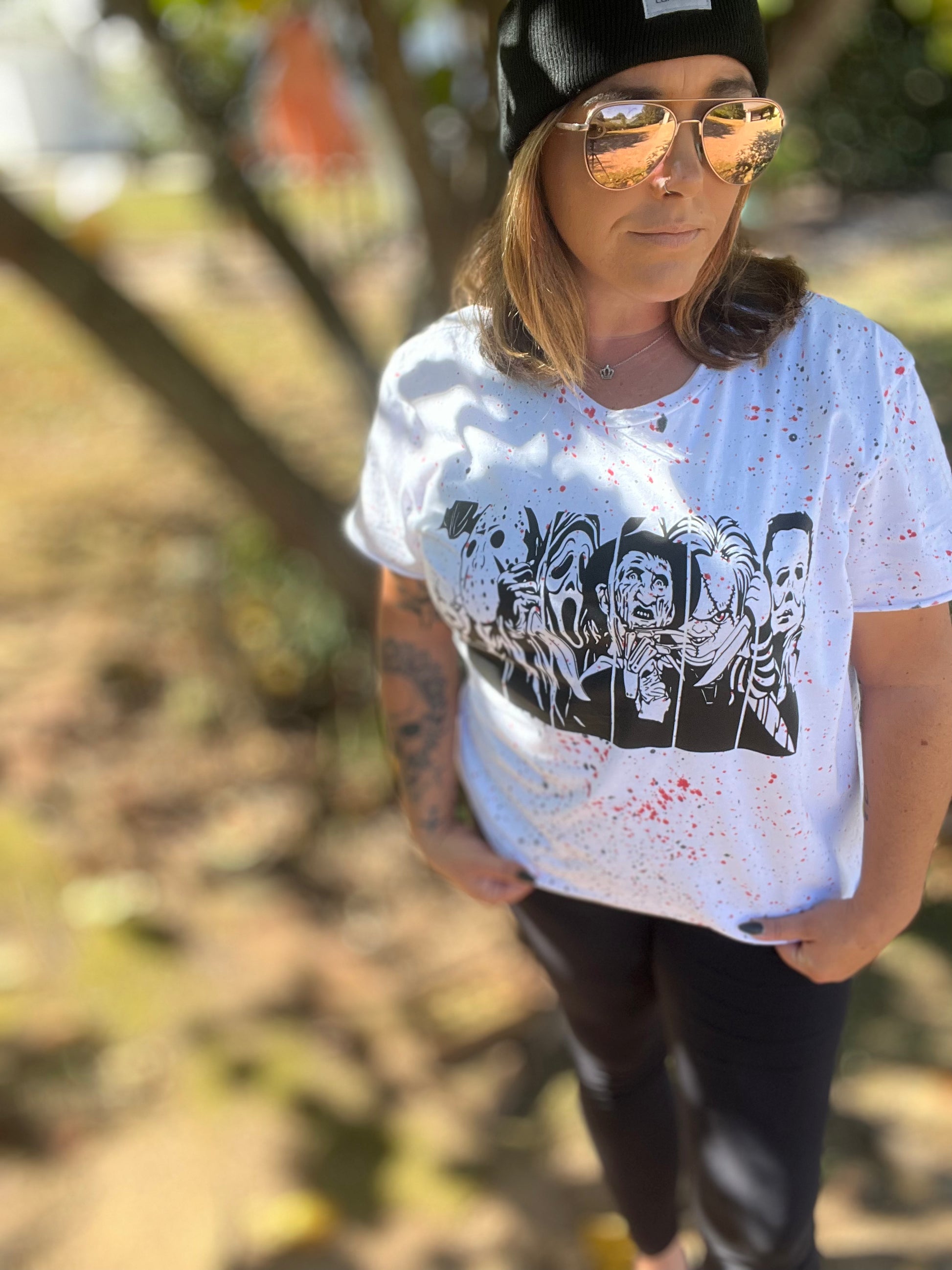 - Black and white halloween slasher favorites screen print transfer on the front