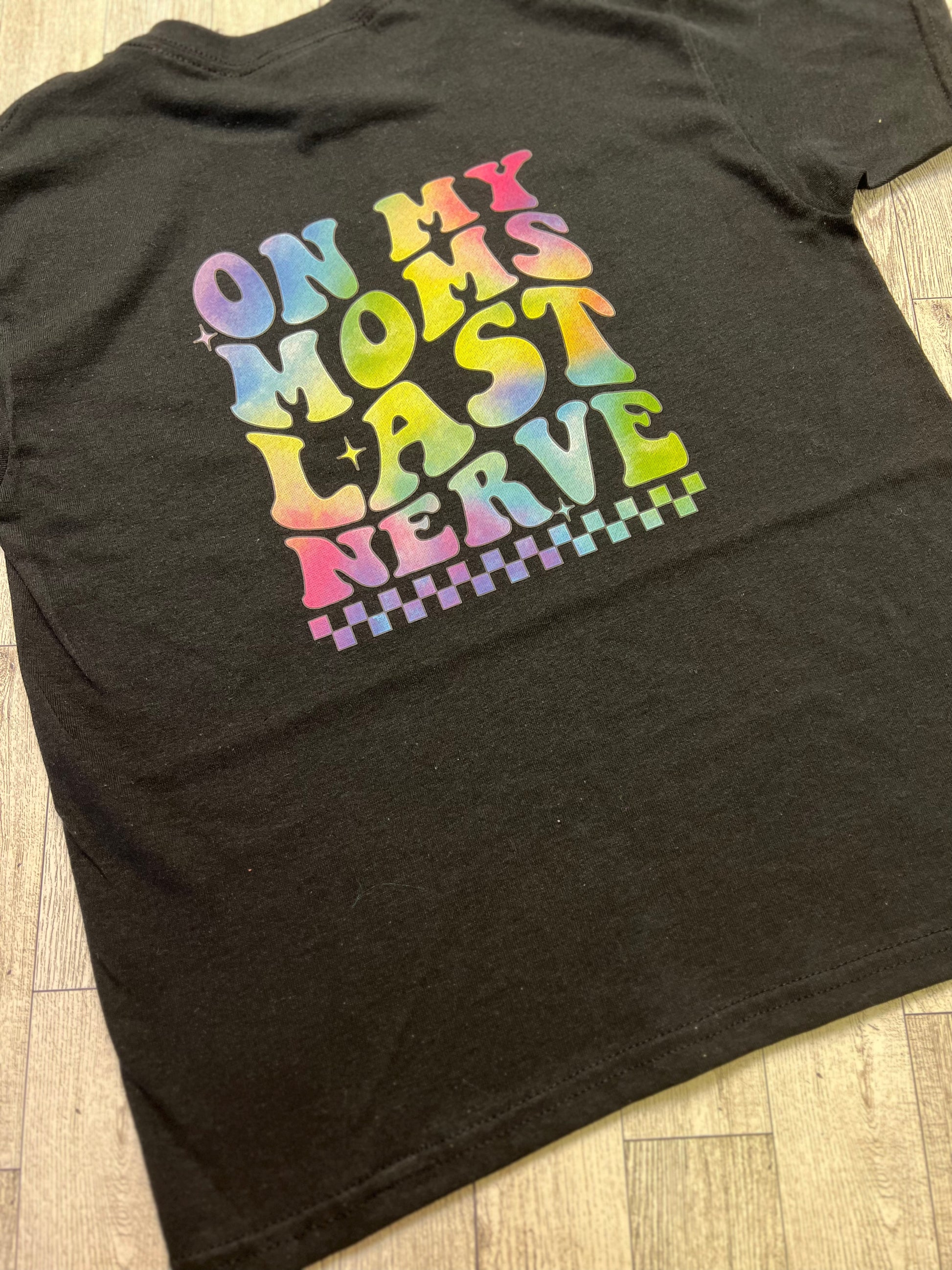 - On my moms last nerve rainbow screen print transfer on front of a black t-shirt