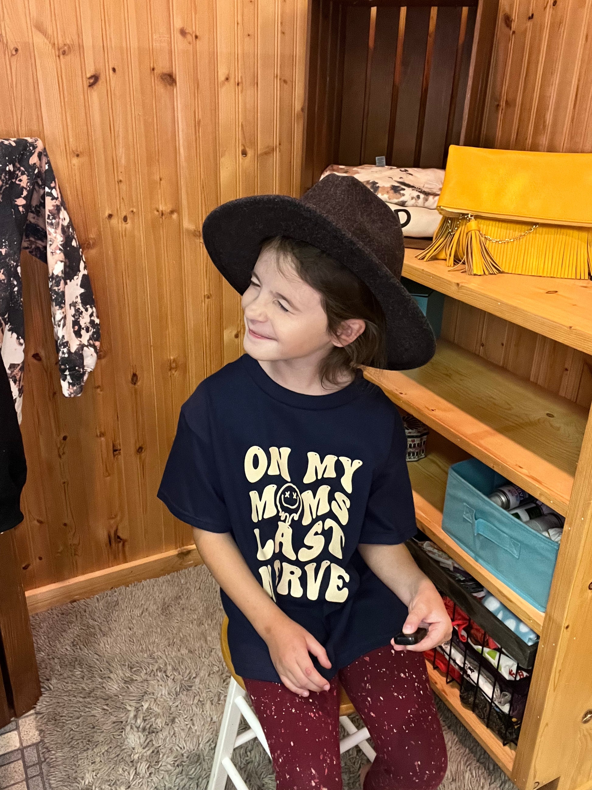 - On my moms last nerve brown screen print transfer on front of a navy blue t-shirt