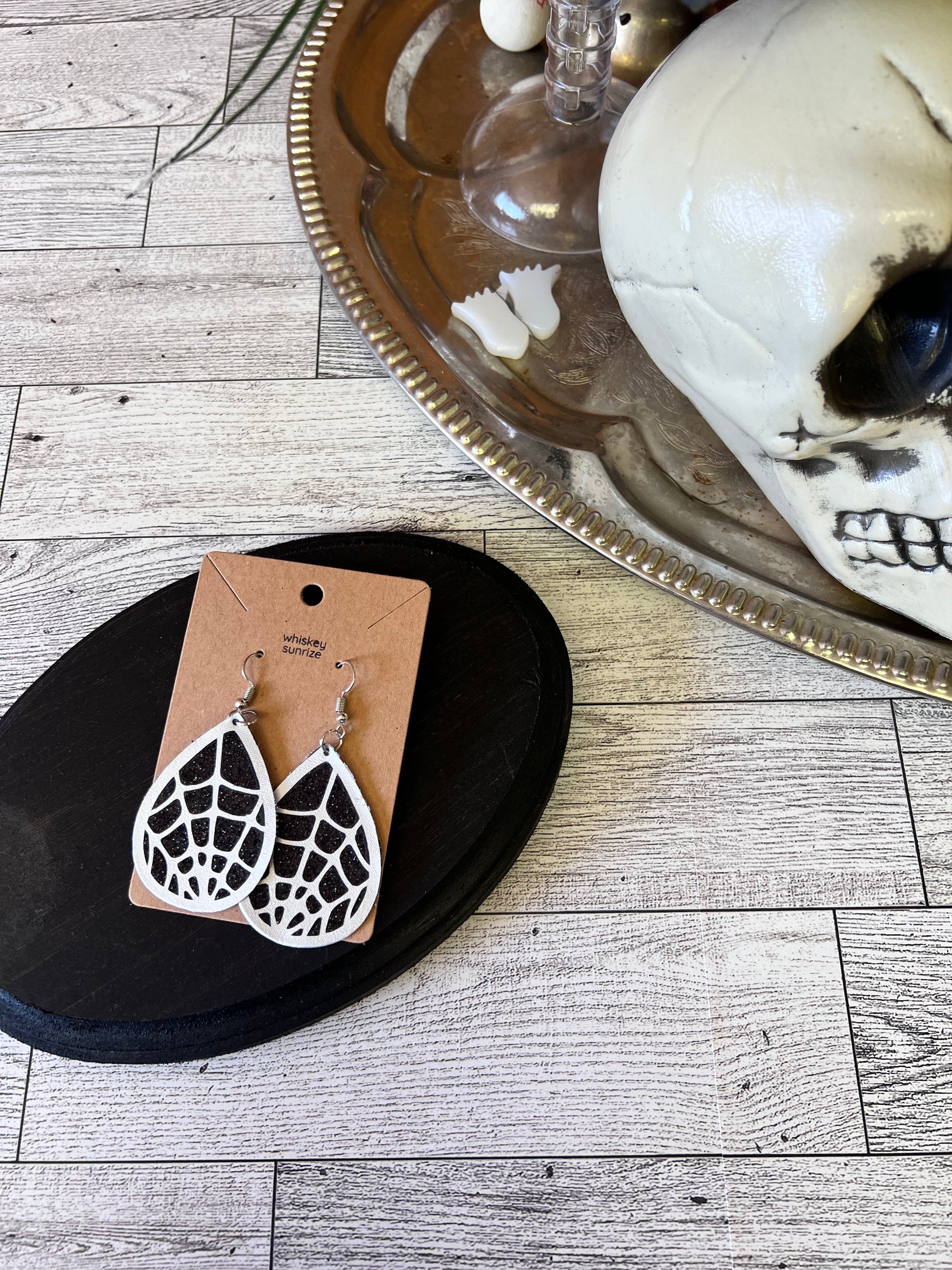 Spin a web of style with these fun Spiderweb Drops! Featuring a unique silver spiderweb print on black glitter faux leather, these earrings will be sure to make a statement. Perfect for any Halloween-year-round look, these drops will add a spooky flair to any outfit!